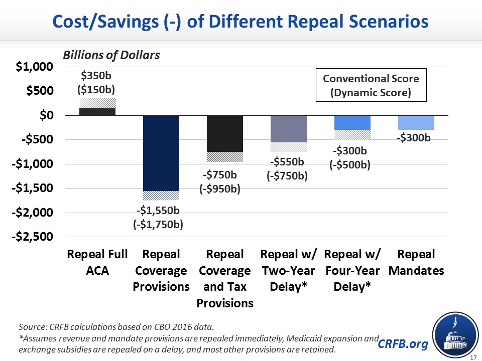 We estimated that the 2016 reconciliation bill – the basis for the current "repeal and delay" discussion – would likely save $550 billion over the 2018-2027 budget window (or $750 billion including economic effects).